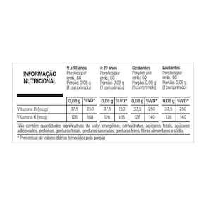 Vantagens: - fácil e agradável de consumir: apresentado em mini comprimidos, facilitando e tornando a ingestão um momento de prazer - as vitaminas d3 e k auxiliam principalmente no funcionamento do sistema imune e no funcionamento muscular, na absorção de cálcio e seu nível no sangue, na absorção do fósforo e na formação de ossos e dentes