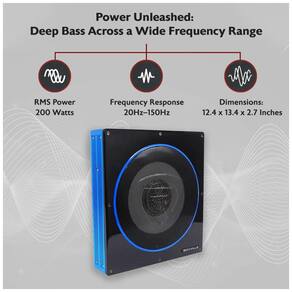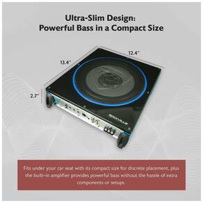 Rockville RW10CA Subwoofer Slim para carro de 800 Watts e Pico de 800 Watts , 200 Watts RMS. Fonte de alimentação PWM MOSFET. Entrada RCA de baixo nível. Entradas de alto nível com tecnologia de otimização automática. Sensibilidade de entrada. Ativação remota com atraso suave. Circuito de proteção térmica, circuito de proteção contra curto. Circuito de proteção contra sobrecarga. Chave de fase 0 graus ou 180 graus Filtro passa baixas 50Hz 150Hz. Aumento de graves 0 18dB 45Hz. Controle remoto de nível de subwoofer. Filtro subsônico integrado a 29Hz. Resposta de frequência 20Hz 150Hz. Sensibilidade 90dB 1w , 1m. Potência máxima RMS 200 Watts. Impedância 2 Ohm. Dimensões 31 x 34 x 6 Centímetros Marca: Não Informado
