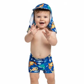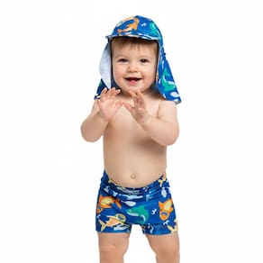 Todo o charme da sunga boxer bebê, com o boné legionário de divertidos tubarões pra completar o look. Este conjunto de Shorts Praia menino com boné legionário da Coleção Tuba Colors da Tip Top é perfeito para a praia e piscina. Possui proteção solar FPS 50+ permanente, com a qualidade Tip Top.