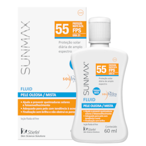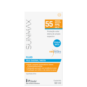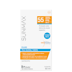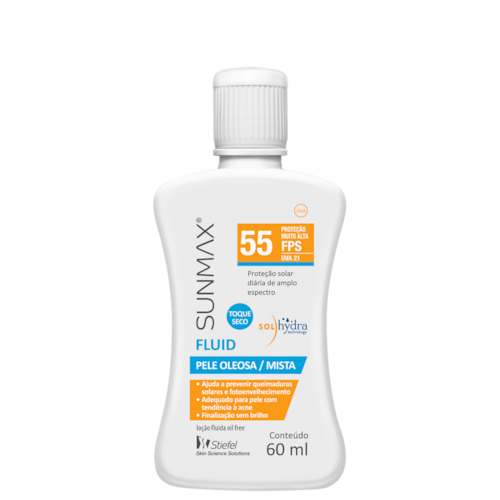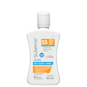 Protetor solar para pele oleosa a mista. Sunmax Fluid FPS 55 oferece toque seco, finalização sem brilho e não obstrui os poros.
