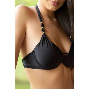 Modelo sunquíni: Top meia taça com bojo, detalhes em metal nas alças e amarração nas costas