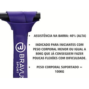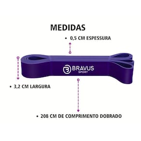 Super Band Bravus Sport Forte Borracha Barra Fixa Elástico Extensor Super Band Forte Roxa 3.2cm de largura Força e robustez, essa é a Super Band Forte da Bravus Sport Perfeita para quem precisa melhorar o desempenho na barra fixa, seja iniciante ou intemediário no pull up ou muscle up, a Super Band Forte vai te levar para outro nível na barra fixa. A Super Band Forte apresenta um design de alta qualidade e é feita com borracha espessa e durável. Ela tem as seguintes especificações: Super Band Elástico Extensor Borracha Crossfit - Nível Forte Nível: Intermediário - AvançadoResistência: de 28kg à 39kg - Média 35kgBeneficios: Fortalecimento e Definição MuscularDimensões: 3,2 cm largura x 0,5 espessura x 208 comprimento dobradoCor: RoxaMaterial : Látex Natural Uso e Benefícios:Além da barra fixa, a Super Band também é perfeita para ajudar você a atingir grupos musculares específicos - Abdômen core , Membros superiores: costas, pernas, peito, ombros, bíceps e tríceps e Membros Inferiores: Coxas, pernas e Glúteos. Para flexões e flexões assistidas, basta passar a faixa por cima de uma barra fixa e você terá um apoio para se exercitar e evoluir na execução do exercício. A super band também funciona muito bem para treinamentos de velocidade e agilidade, força, treinamento funcional, cruzado, Artes Marciais Mistas MMA e muito mais. Leve o seu treino para o próximo nível com a Super Band. Assista um de nossos vídeos e descubra como usar as super bands e potencializar os efeitos do seu treino. Trabalho muscular - Roxa: principalmente nos músculos maiores como os dos membros inferiores Barra Fixa - roxa - Assistência em torno de 30% - Para iniciantes, que precisam de mais assistência para executar os exercícios na barra e progredir com mais rapidez.