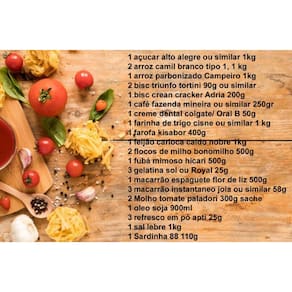 Super Cesta Básica Premium Produtos De Marca 30 Itens Doação Super Cesta Básica 30 Itens Completa Doação Produtos De Qualidade Cesta montada para Com produtos de qualidade e validade longa 1 açúcar alto alegre 1kg 2 arroz camil branco tipo 1 1 kg 1 arroz parbolizado Camil 1kg 2 bisc Show de Bola Parati 90g 1 bisc crean cracker 200g 1 café Caboclo/ Pelé 250gr 1 creme dental colgate/ Oral B 50g 1 farinha de trigo cisne 1 kg 1 farofa kisabor 400g 1 feijão carioca Camil 1kg 2 flocos de milho bonomilho 500g 1 fubá mimoso hicari 500g 3 gelatina sol 25g 1 macarrão espaguete flor de liz 500g 3 macarrão instantaneo joia 58g 2 Molho tomate paladori 300g sach 1 oleo soja 900ml 3 refresco em pó apti 25g 1 sal lebre 1kg 1 Sardinha 88 110g Obs.: Garantimos como marcas dos produtos da cesta salvo em caso de falta de fabricante/por necessidade de , no caso de por outro de igual qualidade. Marca: Não Informado Ean: 7894577800537