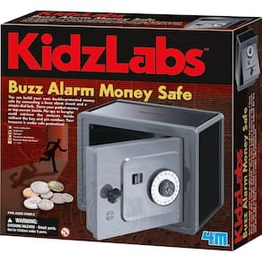 Super Cofre Brinquedo Educativo 4M ou Buzz Alarm Money Safe em seu nome original, possibilita com que a criança construa seu próprio cofre duplamente protegido conectando um circuito de alarme sonoro e uma trava de discagem simples.