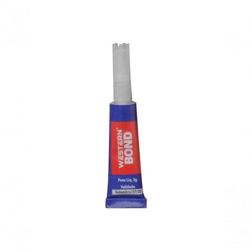Descricao Western Bond e um adesivo instantaneo universal, de fixacao imediata que garante uma rapida e eficaz adesao em diversos materiais como porcelana, borracha, couro, madeira, papel e metal. Para obter o maximo aproveitamento do adesivo, leia atentamente as instrucoes. Caracteristicas: Ideal para superficies porosas; Nao escorre; Pequenos reparos; Fixacao imediata. - Indicacao de uso: Porcelana, borracha, couro, madeira, papel e metal. *Imagens meramente ilustrativas. Especificacao Tecnica - Dimensoes da Peca: 8 x 2 x 1cm - Dimensoes da Embalagem: 9,5 x 1,5 x 16,5cm - Tipo de Embalagem: Blister - Quantidade Inner: 24 Pecas - Dimensoes Inner: 18,5 x 11 x 18cm - Quantidade Master: 288 Pecas - Dimensoes Master: 38 x 36 x 40cm - Material: Ester de Cianoacrilato - Cor: Tubo azul - Marca: Western - Contem: 1 unidade