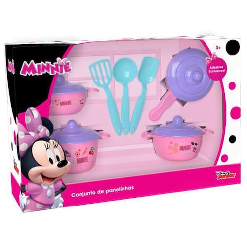 Super conjunto de panelinhas minnie disney junior - mielle Com este conjunto de panelinhas e fogão da minnie as criancas vão brincar de cozinhar. Estimula a interação entre pais e filhos. Ajuda a coordenação motora da criança na distinção de formas e cores. Informações básicas: Marca:mielle Ref:b222 Idade recomendada: acima de 3 anos Contém: 3 talheres - 3 panelas - 1 frigideira - 4 tampas Dimensões da embalagem: 40 cm x 30 cm x 16 cm Código de barras: 7898644600228 Composição: plástico pp material virgem - 100% atóxico Produto certificado pelo inmetro: ce-bri/icepex-n 01284-98 Garantia: contra defeitos de fabricação