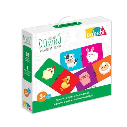 - Brinquedo Super Dominó Animais da Fazenda, da BaBeBi - Cód. 6017. - Indicado para crianças a partir de 3 anos. - Cada peça mede 11 x 5 cm. - Contém 28 peças. - Feito de Papel Cartonado resistente, durável e ecológico. - Possui o Selo Abrinq e o Selo de Segurança do Brinquedo do InMetro: CE-BRI/TUV-0018712.0 . Ean: 7898102626173