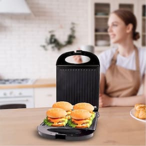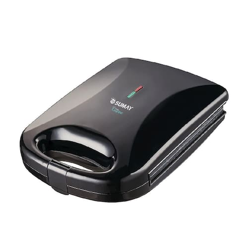 Grill elétrico Sumay com chapas antiaderentes, 1200W de potência, ideal para grelhados rápidos e saudáveis. Design portátil e sistema antiaderente para fácil limpeza.Termostato regulável