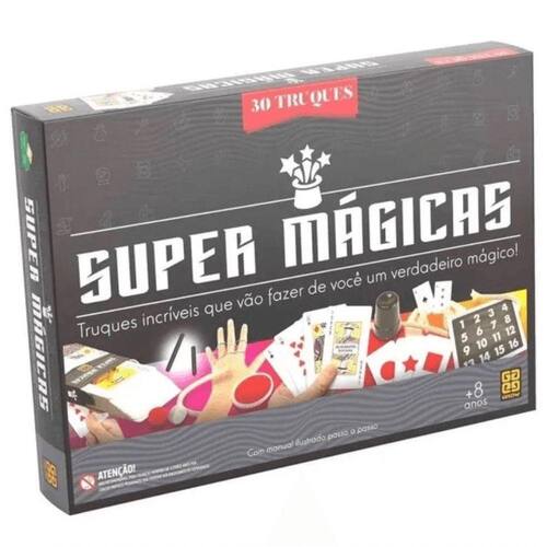 Super Kit De Mágicas - 30 Truques - Grow Que tal se tornar um mágico? Truques que vão surpreender a plateia! Super Mágicas traz copinho que atravessa a mesa, cordas mágicas, moedas que aparecem e desaparecem e muitas mágicas com cartas para deixar todos de boca aberta. Divirta-se! Participantes: 1 ou mais. Código: 054474 Dimensões aprox. da embalagem em cm: 27,1x37,6x5,5 Peso liq. Aproximado do produto na embalagem: 563g Referência do Modelo: 02713 Certificado Inmetro: CE-BRI/ICEPEX-N 01264-25 - NM300-2004 OCP 0046 Conteúdo da Embalagem: Baralho, fichas, cordões, copinho, balão, lenço preto, cartelas, adesivos, bloco de papel, bloco de papel impresso, moedas cartonadas, relógio cartonado, caixinhas cartonadas, varetas, cartas e manual de instrução. Composição/material: Cartonado, Plástico Idade recomendada: a partir de 8 anos Garantia: 90 dias contra defeitos de fabricação pelo fabricante Imagens meramente ilustrativas. As cores e tonalidades podem variar. Gênero - Meninas Meninos Unissex Idade - 8 Anos 9 anos 10 Anos 11 Anos Tipo - Mágicas Ean: 7908010127133