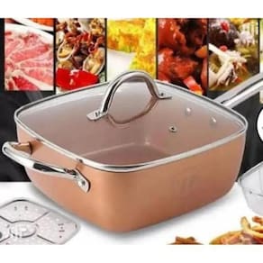Super kit Panela Caçarola Frigideira Titânio / Cerâmica Antiaderente cobre O kit de Caçarola Antiaderente MaxChef é feita de cobre, cerâmica e titânio, permitindo preparar qualquer alimento, seja assando, cozinhando, refogando, salteando ou até mesmo fritando. Acompanha a panela uma tampa de vidro temperado, um cesto de fritura inox e uma bandeja vaporizadora. Seu material resistente suporta temperaturas de até 230ºC e seu revestimento antiaderente permite cozinhar sem usar óleo, facilitando a limpeza. Com a Caçarola MaxChef, você pode preparar uma variedade de pratos, de sopa a guisado para pratos principais e sobremesas. Pizza, batata frita, macarrão, queijo frito, risoto, frango crocante, panquecas, bolo e muitas outras receitas são possíveis. A placa de indução de aço inoxidável, construída diretamente na parte inferior da panela, garante uma condução de calor superior para um cozimento perfeito, uniforme e rápido. Especificações do Produto: - Tecnologia de revestimento resistente a riscos, arranhões e altas temperaturas - Livre de compostos tóxicos como PFOS, PFOA e PTFE - Pode ser Utilizado diretamente na máquina lava-louças. - Serve para Fogões a Gás e Indução. Tamanho: - Diâmetro: 24 cm - Altura: 14 cm - Espessura: 2,0 mm - Comprimento do cabo: 18,5 cm - Peso: 1,30 kg O que você precisa saber sobre este produto Capacidade em volume: 4.8 L Unidades por kit: 1 Corpo fabricado em cerâmica. Cabo fabricado em alumínio. Com um diâmetro de 24cm. Suas dimensões são: 18.5cm x 26cm x 14cm. Seu peso é de 1.3kg. Com superfície antiaderente.