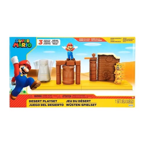 O Desert Playset do Super Mario é um cenário da fase do jogo no deserto com incríveis acessórios. Esse incrível playset tem detalhes iguais ao jogo e três peças interativas: Pokey e Stone Eye deslizantes e a estátua giratória. A está Stone Eye giratória, além do boneco do Mario de 2. Polegadas 6.3 cm . A brincadeira vai ficar mais divertida com o Desert Playset do Super Mario e você ainda pode juntar outros Playsets vendidos separadamente para deixar seu mundo do Mario mais completo