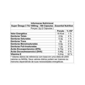 Benefícios - aporte de ácidos graxos essenciais; - ômega 3 epa & dha; Como tomar super omega 3 tg 180caps essential nutrition Recomenda-se ingerir uma 1 cápsula 2 vezes ao dia, com as principais refeições, ou conforme orientação de médico ou nutricionista.