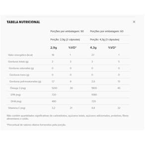 Suplemento de ômega-3 obtido por processo de destilação molecular, com alto grau de pureza e rigoroso controle de metais pesados. Apresenta alta concentração de EPA e DHA e na forma TG proporciona uma absorção otimizada. Com fórmula ultra concentrada e cápsulas de fácil ingestão, é uma opção prática para complementar a alimentação diária.