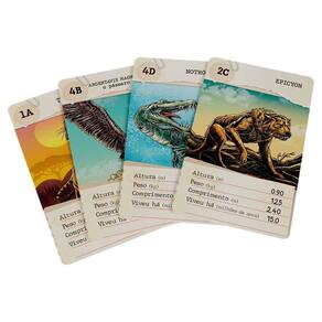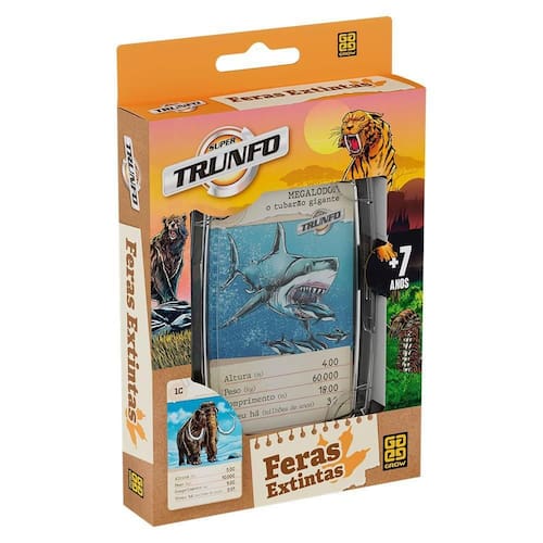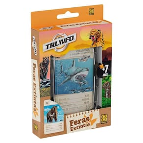 Super Trunfo Feras Extintas traz 32 cartas com imagens e informações de Feras Extintas para uma disputa superdivertida Você compara sua carta com a do outro jogador. Mas escolha bem a característica que vai utilizar a cada rodada, pois, se sua carta ganhar, você fica com a carta do outro jogador; se perder, ele fica com a sua No final, vence quem ganha todas as cartas do jogo. Homologação Inmetro: CE-BRI/IQB 006433 55100/22-001