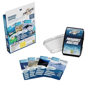Super Trunfo Predadores Aquáticos traz 32 cartas com ilustrações e informações sobre os predadores dos mares. Em qual item o predador da sua carta é o melhor Será no peso Na agressividade Ou você tem o Super Trunfo Escolha, compare e vença esta emocionante disputaHomologação Inmetro: CE-BRI/IQB 006429 54879/21-004