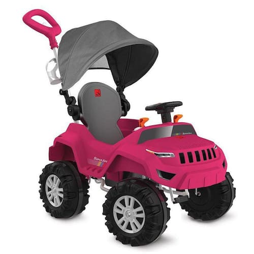 Superjipe reclinável com capota passeio & pedal pink 586 Superjipe reclinável com capota passeio & pedal pink Categoria:Carros a pedalLançamentosPasseio do bebêCod. referência: 586Cod. barras 7899091405862Descrição:Um produto com duas funções, prático e moderno para o adulto e divertido para as crianças!Função passeio: o adulto conduz o super jipe passeio e pedal como um carro de passeio.Função pedal: permite a criança brincar livremente como um carro a pedal. Basta remover o assoalho e a haste removível.Assoalho removível: converte rapidamente o brinquedo entre as funções passeio e pedal.Haste direcionável e removível.Capota articulável, retrátil e removível.Painel de atividades e volante com chip sonoro.Assento reclinável em 3 posições.Freio de segurança.Suporte para bolsa/ sacola na alça da haste .Suporte para garrafa d'água, mamadeira ou squeeze na haste .Cinto de segurança removível com prático sistema de abertura lateral.Rodas com anel antiderrapante: proporciona um deslocamento suave e sem ruído.Painel interativo. Idade: +12 meses.Peso máximo suportado: 25kg.Ce-bri/innac-00143-01 a.Dados técnicos manual do produtoProduto:Dimensões: c,l,a 127,0 x 61,5 x 98,0 cm Embalagem:Dimensões da caixa: c,l,a 92,5 x 57,0 x 62,5 cmQuantidade: 1