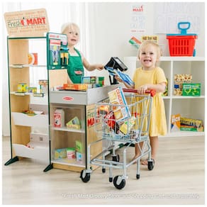A mercearia Fresh Mart de madeira é um brinquedo resistente e divertido para crianças a partir de três anos. Com cantos e bordas suaves e curvas, os clientes podem navegar pelas prateleiras e pagar pelas compras de um lado, enquanto o dono da mercearia registra os itens do outro. O produto inclui um leitor de bipe, correia transportadora com manivela, máquina de limpeza de cartões, calculadora com teclado e gaveta de dinheiro. As amplas prateleiras em ambos os lados permitem exibir e armazenar produtos. O estilo e as cores podem variar. Este produto é certificado pelo Forest Stewardship Council, garantindo que os materiais provêm de florestas gerenciadas de forma responsável que proporcionam benefícios ambientais, sociais e econômicos, protegendo as florestas para as gerações futuras. É um ótimo presente para crianças em idade pré escolar, de 3 a 6 anos, que valorizam produtos práticos e sem tela. A certificação FSC se aplica apenas a novos inventários FSC C156584.