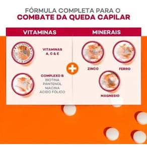 Ativos: Complexo B: Ação fundamental na formação da queratina, responsável pela manutenção da resistência dos fios e unhas. Vitaminas A, C & E: Ação antioxidante diretamente sobre o bulbo, com estímulo à síntese de colágeno e formação das fibras de queratina, responsável pela sustentação da estrutura do bulbo capilar.