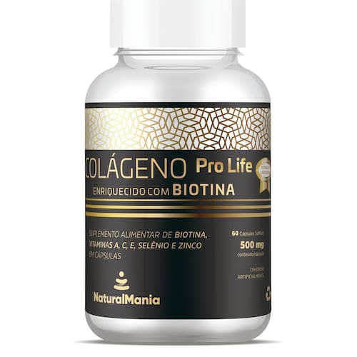 Colágeno pro lifeProduto dispensado de registro conforme RDC 240/2018Enriquecido com biotinaSuplemento alimentar de colágeno com biotina, vitaminas a, c, e, selênio e zinco em cápsulasBeleza absoluta com colágeno pro lifeTenha uma pele firme, unhas fortes, cabelos brilhantes e ossos resistentesO colágeno é uma das proteínas mais importantes do corpo humano, responsável por dar firmeza à pele, desempenha várias funções, tais como: manter as células unidas e fortalecer os tecidos, constituindo uma das proteínas fundamentais para órgãos como os ossos, cartilagens, tendões e pele.Fortalece a peleMelhora a saúde das articulaçõesBom para cabelos, pele e músculosForma novos tecidos e trata lesões na cartilagem articularAs vitaminas a, c, e, b7 biotina e os minerais zinco e selênio presentes na composição auxiliam para o bom funcionamento do organismo com ação antioxidante contra os radicais livres, protegendo contra a baixa imunidade, auxiliando para saúde da pele, unhas e cabelos e no bom funcionamento dos órgãos reprodutores.Cabelos fortes e saudáveis com um brilho ofuscante O poder da biotina encontrado no colágeno pro life da naturalmania, auxilia no metabolismo energético, proteínas, carboidratos e gorduras, contribuindo para dar mais brilho e hidratação para seus cabelos. A biotina junto com o zinco atua de dentro para fora no mecanismo celular dos fios de cabelos, mantendo-os sempre lindos e saudáveis. Unhas firmes e saudáveisA biotina é muito importante para a saúde de diversas partes do corpo, isso inclui as unhas. Ela auxilia no seu crescimento saudável, recuperando unhas quebradiças, e auxiliando no seu fortalecimento. É extremamente importante o tratamento com esse nutriente, para combater a síndrome das unhas frágeis. Maior absorção de vitaminasDiferente de diversos suplementos que contém óleo de soja, o colágeno pro life contém óleo de semente de uva, que propicia um sabor agradável e ajuda na absorção das vitaminas. Proporcionando proteção ao cérebro e aos nervos espinhais dos danos impostos pelos radicais livres mais potentes.E também é um ótimo hidratante, previne estrias e celulitesAção antioxidante rico em vitamina c e e, com propriedades antioxidantes, previne a formação de placas de gordura nas artérias, prevenindo doenças como infarto, aterosclerose e avc.Ajuda a combater a queda de cabelo o óleo de semente de uva também potencializa a hidratação dos cabelos, ajudando a prevenir as pontas duplas, a queda excessiva e as fibras frágeis e quebradiças, além de também contribuir para reduzir a caspa e manter o couro cabeludo hidratado.Protege o coração além disso, contém gordura polinsaturada, principalmente ômega 6, ajudando a regular o colesterol ruim ldl , cuidando da saúde do coração, que quando combinada com uma alimentação saudável e a prática de exercícios físicos, ajuda a mantê-lo saudável, além de evitar o envelhecimento da pele.Pele macia e hidratada o óleo de coco, presente no colágeno prolife da naturalmania, auxilia na hidratação do rosto além de prevenir o aparecimento de rugas devido à elevada concentração de antioxidantes em sua composição. Os principais benefícios do óleo de coco são: o óleo de coco mantém a pele macia sem obstruir os poros e sem deixá-la oleosa Ajuda no fortalecimento e elasticidade da pele o segredo dessa substância está no fato de ser uma proteína que o próprio organismo é capaz de produzir. Uma de suas principais funções é formar as fibras que dão sustentação à pele. Essencial para os músculos, ossos e tendões cabelos, unhas, ossos e cartilagens tecidos que amortecem as articulações também são beneficiados. Ou seja, ela garante que o corpo funcione bem por dentro e fique bonito por fora.Seu aliado contra a idade com o tempo nosso corpo diminui a produção de colágeno. O consumo das cápsulas de colágeno ajuda na redução das marcas de expressão causadas pela idade.