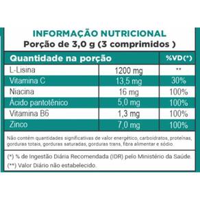 Suplemento Alimentar de Lisina, Zinco, Niacina, Ácido Pantotênico, Vitaminas C e B6 90 Comprimidos de 1000mg.A lisina é um aminoácido que pode ser utilizado no combate ao herpes.Sua função é inibir a ação da arginina, uma substância que atua a favor do herpes simples.O zinco contribui para a manutenção de cabelo, da pele e das unhas.A niacina auxilia na manutenção de mucosas.O ácido pantotênico auxilia no metabolismo energético.A vitamina C auxilia na formação do colágeno.A Vitamina B6, C e Zinco auxiliam no funcionamento do sistema imune.Modo de ingestão:Sugere-se a ingestão de 1 comprimido 3 vezes ao dia. Ingerir com líquido.Ingredientes:Cloridrato de lisina, polpa de acerola, polpa de romã, bisglicinato de zinco, niacinamida, ácido ascórbico, pantotenato de cálcio, cloridrato de piridoxina, agente de massa: celulose microcristalina, aroma idêntico ao natural de laranja com acerola, lubrificantes: estearato de magnésio e dióxido de silício, acidulante: ácido cítrico e edulcorantes: sorbitol, sucralose, stévia e taumatina. Cada comprimido contém 500 mg de cloridrato de lisina.Livre de lactose.Não contém glúten.Produto autorizado para comercialização em todo território nacional através da RDC 240/2018 da ANVISA, AFE do MS 6.02234-1