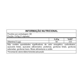 Ingredientes: óleo de girassol, água purificada, colecalciferol, gelificante gelatina, umectante glicerol, corante curcumina e antioxidante DL-alfa-tocoferol.