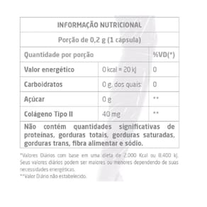 Colágeno nativo tipo II, (estabilizante) celulose microcristalina e (antiumectante) dióxido de silício. Cápsula: (gelificante) gelatina e (corante) dióxido de titânio. “ALÉRGICOS: PODE CONTER DERIVADOS DE PEIXE, SOJA E AMENDOIM”. “NÃO CONTÉM GLÚTEN”.
