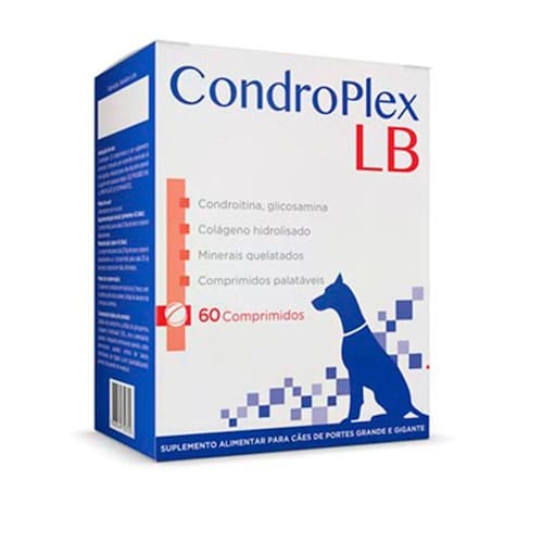 Condroplex LB Suplemento Para Cães C/ 60 Comprimidos - Avert Condroplex LB é um suplemento alimentar composto por nutrientes essenciais a articulações Condroplex é coadjuvante no tratamento de lesões e disfunções da articulação provocadas por doenças degenerativas como artrites, artroses, desgastes articulares em geral, além de auxiliar também na recuperação de cartilagens lesionadas decorrente de doenças degenerativas ou prevenindo e retardando a velocidade de deterioração da cartilagem ao longo da vida. Estudos com animais portadores de osteoartrites suplementados com esses nutrientes demonstraram um efeito na redução da dor, diminuição da taxa de claudicação (animal mancando) e melhora das níveis de glicosaminoglicanos nas cartilagens. CondroPlex LB comprimidos é um suplemento nutricional composto por nutrientes essenciais às articulações: COLÁGENO HIDROLISADO, sulfato de condroitina A, sulfato de glicosamina e minerais quelatados (Zn, Cu, Mn). Indicação de uso Indicado para cães de portes grande e gigante em qualquer idade, que se beneficiem do aporte desses nutrientes. USO PROIBIDO NA ALIMENTAÇÃO DE RUMINANTES Modo de usar Suplementação inicial (primeiros 42 dias): 1 comprimido/ 25 kg de peso corporal ao dia. Manutenção (após 42 dias): 1/2 comprimido/ 25 kg de peso corporal ao dia OU 1 comprimido/ 25 kg de peso corporal em dias alternados. Composição sulfato de condroitina, sulfato de glicosamina, colágeno hidrolisado (5%), zinco aminoácido quelato, manganês aminoácido quelato, cobre aminoácido quelato, aroma de bacon, hidrolisado de fígado suíno (palatabilizante), extrato de parede de levedura.