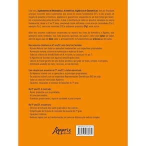 Este livro, Suplementos de Matemática: Aritméticos, Algébricos e Geométricos, tem por finalidade principal transmitir estes suplementos aos alunos do ensino fundamental (EF). A obra propõe um resgate de assuntos aritméticos, algébricos e geométricos, esquecidos há um bom tempo por docentes e desconhecidos pelos discentes. A obra é constituída de todos os assuntos estudados no ensino fundamental, desde o 6º ao 9º anos, envolvendo teoria suficiente e uma série de curiosidades (Cur.), exemplos (Ex.), exercícios resolvidos (ER) e problemas propostos (Pp), entre outros. Além dos assuntos tradicionais encontrados na maioria dos livros de Aritmética e Álgebra, este apresenta várias novidades, tais como assuntos opcionais, dos quais o leitor pode optar por saber, além de alguns que ele deve saber e, principalmente, os fundamentais que precisa que ele saiba. Dos assuntos relativos ao 6º ano/EF, este livro traz também: • Número Natural com todas as operações fundamentais e as respectivas propriedades; • Numeração romana, sistema de numeração e mudança de base; • Todos os critérios de divisibilidade em N, inclusive, os casos por 6 e por 7; • O Algoritmo de Euclides com algumas simplificações úteis; • Cálculo da fração geratriz de uma dízima periódica, que pode ser exata, simples e composta; • Sistema de unidades de medir, inclusive, as não decimais. Com relação aos assuntos do 7º ano/EF, o leitor encontrará: • Os Números Inteiros com as operações e as principais propriedades; • Os produtos notáveis com as respectivas Representações Geométricas (RG) de cada; • Todos os casos de Fatorização Algébrica; • Equações, inequações e sistemas de equações do 1º grau. No 8º ano/EF, é mostrado: • Razão, proporção e as propriedades, • As principais médias, • Grandezas proporcionais, regra de sociedade e juros simples. No 9º ano/EF, encontrará: • Técnicas de extração das raízes quadradas e das cúbicas; • Simplificação da fórmula de resolução da equação do 2º grau; • Equações trinômias; • Radicais duplos com as transformações em soma ou diferença de radicais simples.