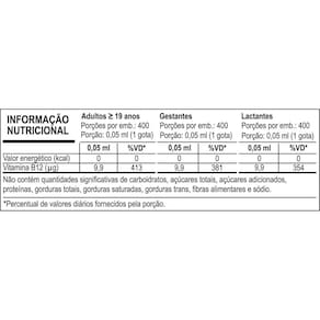 Essencial para o funcionamento do organismo humano, a vitamina b12 é produzida através de alimentos ingeridos na alimentação, como carne bovina, peixe, frutos do mar, ovos, leite e derivados. Também conhecida como cobalamina, a vitamina b12 possui 2 formas, a cianocobalamina, sua forma sintética que será convertida em metilcobalamina dentro do organismo; e a metilcobalamina, sua forma natural e mais biodisponível, pois assim que ingerida já será absorvida. Apresentações: frasco com 20 ml da solução sublingual, contendo 9,9mcg de meticobalamina por gota, com sabor de frutas negras. Composição: água purificada, metilcobalamina, agente de massa glicerina, aroma idêntico ao natural de frutas negras, acidulante ácido cítrico e conservantes benzoato de sódio e sorbato de potássio. Sugestão de uso: ingerir 1 gota pela manhã, sublingual ou conforme orientação . Recomendação de uso: pessoas com 19 anos ou mais, gestantes e lactantes. Contém alto teor de vitamina b12 - metilcobalamina 9,9mcg por dose vitamina b12 gotas apisnutri rende 400 doses. Rápida absorção sublingual Produto vegano Não contém glutén Marca: Não Informado Ean: 7899468511165