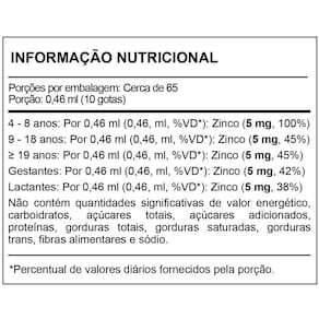 Ingredientes Água, bisglicinato de zinco, agente de massa glicerol, reguladores de acidez ácido cítrico e citrato de potássio, emulsificante lecitina, aromatizante, estabilizante goma acácia e edulcorante taumatina.