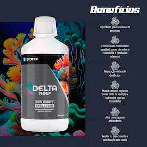 O delta reef é um suplemento para aquários marinhos a base de aminoácidos e ácidos orgânicos. Os aminoácidos são necessários para síntese de proteínas, o que é crucial para o crescimento, reparação de tecidos danificados e reprodução dos corais. Além disso, os aminoácidos também podem atuar como agentes antioxidantes, ajudando a proteger os corais contra danos causados pelo oxidativo e resistência a condições adversas. PRINCIPAIS CARACTERÍSTICAS: O produto contém carbono orgânico, uma fonte importante de energia e nutrientes que auxilia no processo de fotossíntese das algas zooxantelas, e também auxilia no crescimento de calcificação dos corais. Promove um crescimento saudável cores vibrantes e resistência a condições adversas. INSTRUÇÕES DE USO: Aplicar 10 gotas para cada 50 litros de água a cada 7 dias, ou 1 ml para cada 100 litros a cada 7 dias. EMBALAGEM: 1000 ml