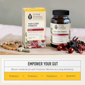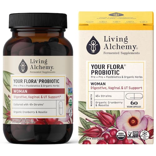 Suplementos de saúde intestinal Living Alchemy para mulheres - Your Flora Probióticos Women com soja fermentada, suco de cranberry, roselle, prebióticos, enzimas digestivas e probióticos - veganos, não transgênicos, 60 unidades