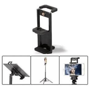Suporte 2 Em 1 Smartphone E Tablet Para Tripé E Bastões Selfie Este Suporte 2 em 1 para Celulares/SmartPhone e Tablet Universal para Tripé, Monopé e Bastão Extensor Selfie fornece durabilidade e confiabilidade que sua fotografia e cinematográfica merecem. Suporte ajustável pode ser inclinado para visualizações horizontais e verticais com 2x Roscas de 1/4 e compatível com Telefones / SmartPhone com medidas 5.5cm até 8.5cm e Tables com medidas 11cm até 18.5cm, sendo compatível com praticamente todo os tablets, telefones celulares, Ipad do mercado.O Suporte 2 em 1 para Celulares/SmartPhone e Tablet possui Base e lateral com Rosca Universal de 1/4, perfeito para grava vídeo, tira fotos ou usa seu telefone e Tablet simultaneamente como uma webcam. Feito com material de alta qualidade feito de liga de alumínio de alta qualidade e plástico ABS, não se desvanece, não enferruja, extremamente durável. A tela do seu SmartPhone ou Tablet não é tocada pelo conector do tripé, então você não precisa se preocupar em Arranhar ou deixar marcas na tela.Características: Fácil ajuste, rotação de 360º; Base e lateral com Rosca Universal de 1/4 Excelente para conversas em Face-Time; Faça gravações de filmes sem tremidos; Transforme seu aparelho em uma Webcam; Hastes SmartPhone reguláveis de 5.5cm até 8.5cm e para Tablets de 11cm até 18.5cm Adapta-se a qualquer Tripé padrão e bastão de selfie, extremamente fácil de usar e fácil de configurar.Obs: Apenas Suporte para Smartphone e Tablet, Tripés e outros equipamentos não inclusos, apenas para ilustrar o uso do equipamento. Ean: 0760585509335