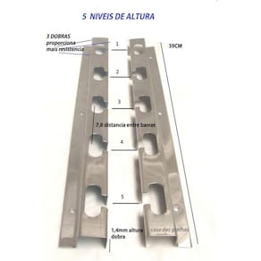 - possui 5 níveis de altura - Suporte com 3 dobras - para dar maior sustentação e chapa 0,70mm - Barra de 1/2 polegadas - Tem alta resistência a corrosão por sem em inox - Fácil limpeza, por ser inox polido - Excelente acabamento e designe, deixe sua churrasqueira moderna - Fácil instalação - utilidade em churrasqueiras de alvenaria, gourmet e pré-moldada