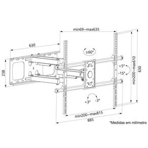 :: Material: Aço Carbono; :: Carga máxima: 75kg; :: Compatibilidade VESA: 200x200 a 800x600 mm HxV ; :: Distância mínima da parede: 6,9 cm; :: Distância máxima da parede: 63,5 cm.