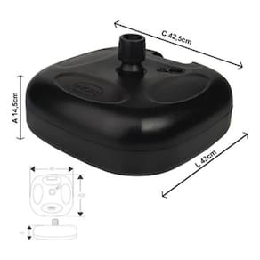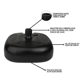 Suporte / Base Guarda Sol Ou Ombrelone Até 22kg Mor Preto Se você busca um suporte prático com bom custo-benefício, a Base para Guarda-Sol ou Ombrelone Mor é a escolha acertada. Produzida em polietileno de alta resistência, esta base tem capacidade para 18 litros de água (aproximadamente 18 kg) ou 22 kg de areia. Quando preenchida, mantém o guarda-sol fixo mesmo sob ventos intensos. Além disso, é muito prática: se estiver na piscina, pode ser preenchida com água. Se estiver na praia, pode ser preenchida com areia. Para armazenar ou transportar, basta esvaziar para que fique extremamente leve.