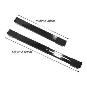 A instalação é super fácil e rápida. Basta ajustar o suporte ao tamanho desejado e pronto! Ele possui dimensões variando de 40cm até 69cm de largura e profundidade mínima de 44cm. Sua altura é de 3,5cm, tanto na mínima quanto na máxima. E sua largura é de 5cm.