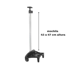 Adapte a mochila de costa no carrinho tornando mais fácil o transporte sem prejudicar a coluna com tantos livros e cadernos. Feito de alumínio e plástico resistente pode ser adaptado facilmente tendo uma ferramenta PHILIPS para apertar os parafusos das placas. Podendo se adaptados em malas ou caixas respeitando o peso de até 7kg e medidas do produto sem as variações pois se trata de encaixe sem regulagem.