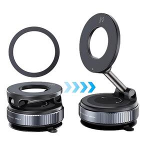 Fixação a vácuo para estabilidade em superfícies lisas, braço articulado 360° para ajuste de ângulo do celular, inclui anel magnético, base com 6 cm de diâmetro, peso 120g.