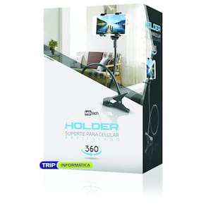 Material: metal, borracha e plástico injetado Encaixando o aparelho no suporte: 12,0 cm de abertura mínima Ajuste do encaixe: retrátil com molas de metal Ajuste de ângulo: 360°