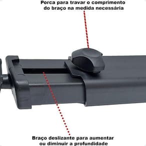 Suporte totalmente articulado, você pode regular a profundidade que seu smartphone ficara, ou seja, regule a que distância você quer que seu smartphone fique do vidro do carro em seu sentido.