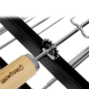 O segundo apoio de espetos frontal é móvel para facilitar o uso e o acesso à grelha deixa o manuseio mais confortável. Todos os apoios frontais possuem sistema multiponto com 17 posições diferentes para girar Espetos e Grelhas GIRAGRILL. Facilita muito o controle do grelhado que fica mais uniforme e evita a exposição direta sobre o calor da brasa. Tem acabamento em aço reforçado, com pintura eletrostática.