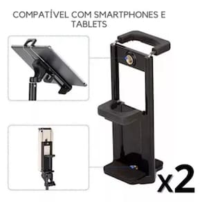 Suporte Para Celular/Tablet: O Suporte Universal é compatível com celulares que possuem largura mínima de 5,5cm e máxima 9cm e com tablets que possuem largura mínima de 11cm e máxima de 17cm. Possui encaixe de rosca 1/4 possibilitando encaixe em tripés e estabilizadores não inclusos .