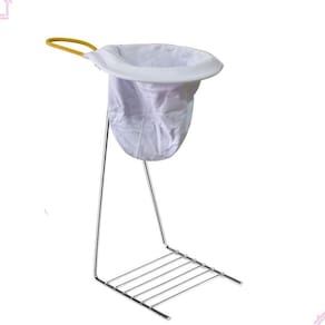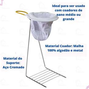 Feito em aço cromado de alta qualidade, o suporte possui medidas de 13 cm de diâmetro, 31 cm de altura e 15 cm de largura. Já o coador é confeccionado em malha 100% algodão, com aro e cabo de arame galvanizado, garantindo durabilidade e resistência.