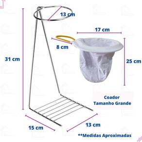 Medidas: - Suporte: 13 cm diâmetro x 31 cm altura x 15 cm largura - Coador: 16 cm diâmetro x 25 cm comprimento