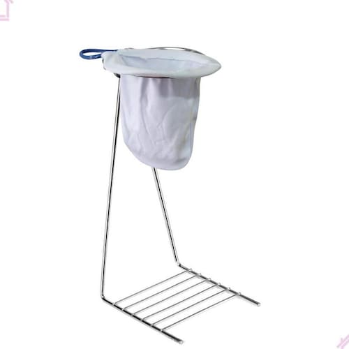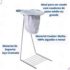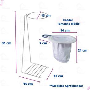 As medidas desse suporte são 13 cm de diâmetro, 31 cm de altura e 15 cm de largura. Já o coador possui 14 cm de diâmetro e 21 cm de comprimento. O material do suporte é aço cromado, enquanto o coador é feito de malha 100% algodão, com aro e cabo de arame galvanizado.
