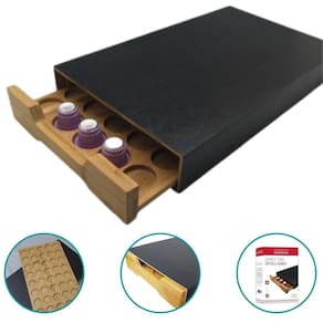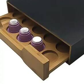 Feito em bambu, esse suporte possui gaveta que ao ser mantida fechada, preserva suas capsulas por muito mais tempo e esteticamente fica mais bonito por elas não aparecerem.