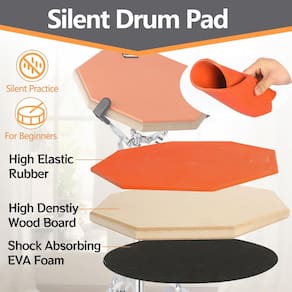 - Almofada de tambor de dois lados: as pastilhas de treino de bateria são leves e resistentes, com borracha de alta resiliência não tóxica e base de madeira de álamo para excelente capacidade de resposta e reprodução. A espuma de absorção de choque de alta densidade oferece maior isolamento acústico e não perturba seus vizinhos