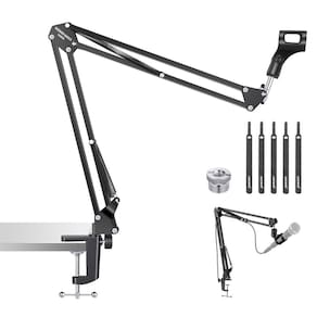 -?Flexível e ajustável?O suporte para microfone de mesa oferece flexibilidade impressionante com uma base que pode girar 360° horizontalmente e ajustar 135° verticalmente. A junta do braço da lança de baixo perfil do tampo da mesa permite subir e descer 180°, enquanto o clipe do microfone suporta uma rotação de 270° para um posicionamento preciso. Todos são protegidos com botões de aperto manual, garantindo estabilidade durante o uso. Como criador de conteúdo essencial, o influenciador deve ter acessórios de streaming e gravação