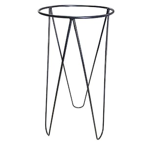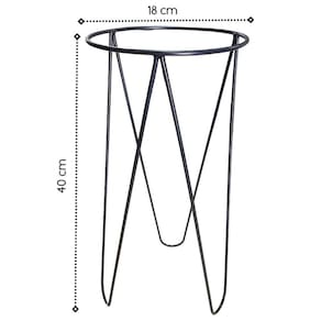 Características * Material: Arame BTC (Baixo teor de Carbono) * Pintura Eletróstática * Cor: Preto * Altura: 40cm * Largura: 18cm * Arame: 4,5mm * Peso: 0,386g * Carga Máxima: 20kg * Diâmetro do encaixe do vaso: 18cm * Vasos não inclusos